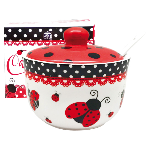 Керамическая сахарница с ложкой "Божья коровка" объемом 450 мл. Диаметр - 11 см, высота - 7,5 см.