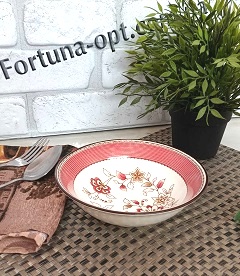 Салатник 7 Розовый орнамент. Керамическая глубокая тарелка объемом 0,5 л. Украина всегда славилась и была одной из первых стран, где люди употребляют первое блюдо и поэтому всегда есть спрос покупателя на глубокую тарелку. Именно в такую форму тарелки очень удобно наливать жидкую пищу и подавать к столу, чтобы минимизировать случайный пролив извне. Самое главное - подобрать ту тарелку, которая бы не только выполняла свое прямое назначение, но и придавала Вам настроение, а так же была элементом комфорта. Купить тарелку глубокую оптом по самым низким ценам вы можете у нас на сайте: Fortuna-opt.com.ua