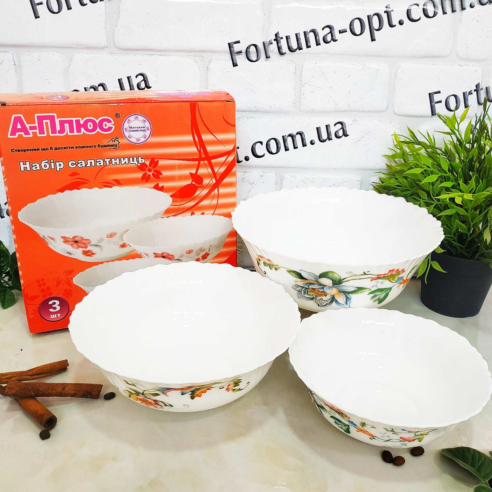 Набор салатниц 1862 (3 шт) оптом от ТМ А-Плюс. Набор изготовлен из матовой стеклокерамики, что характеризует данный товар надежным и долговечным в использовании. Легко моется. Поверхность глянцевая, устойчивая к механическим и химическим воздействиям. Не впитывает посторонние запахи. Внешняя сторона рельефна с нанесенным цветочным орнаментом. Набор упакован в яркую коробку и может стать хорошим подарком. Купить салатник, набор салатников недорого, оптом, от производителя вы можете у нас на сайте: Fortuna-opt.com.ua