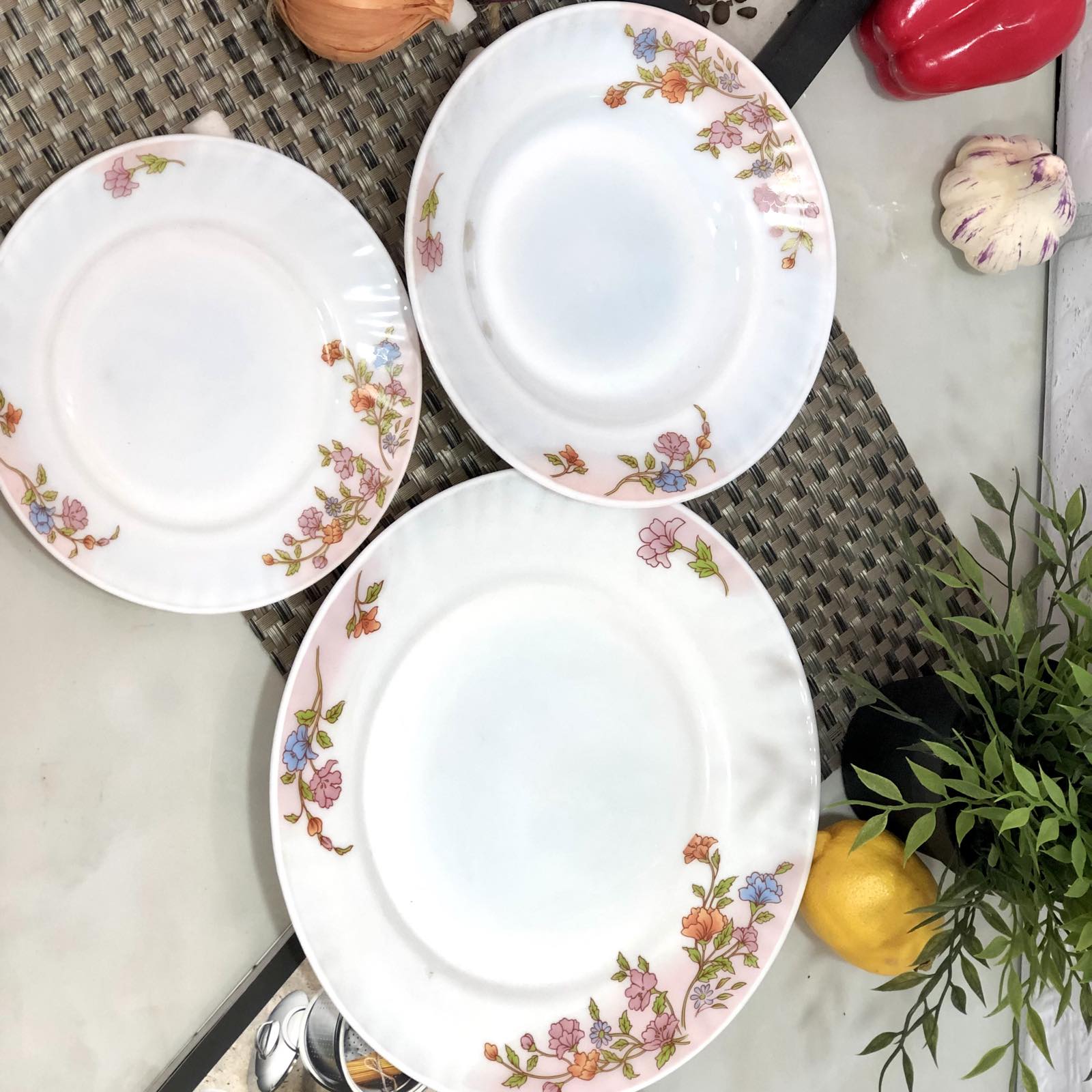 Обеденный сервиз A-Plus - 1852 изготовлен из стеклокерамики. Традиционно состоит из 18 предметов: глубокие тарелки - 6 шт., десертные тарелки - 6 шт., обеденные плоские тарелки - 6 шт.Характеристики сервиза с цветами A-Plus - 1852