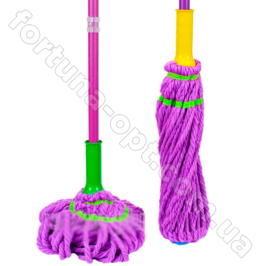 Тип: веревочная швабра. Материал рукоятки: окрашеный металл, пластиковые накладки. Материал основания: пластик. Материал насадки: хлопок. Тип рукоятки: цельная. Общая длина: 130см. Наличие механизма отжима: есть. Основное назначение: для пола. Цвет: фиолетовый/салатовый.