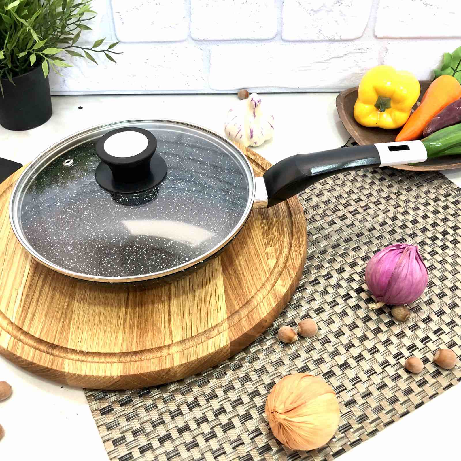 Удобная в использовании за счет гранитного покрытия, которое позволяет жарить без всяких проблем без масла или с минимальным количеством масла. Изготовлена из высококачественного литого алюминия, который характеризуется высокой теплопроводностью. Ручка сковороды имеет силиконовое покрытие выполненное по технологии soft-touch. Стеклянная крышка изготовлена из толстого, устойчивого к высоким температурам материала. В такой сковороде можно жарить и тушить овощи, мясо, рыбу, готовить соусы и зажарки для супа или борща и другие кулинарные шедевры.Особенности сковороды из алюминия A-Plus - 1480