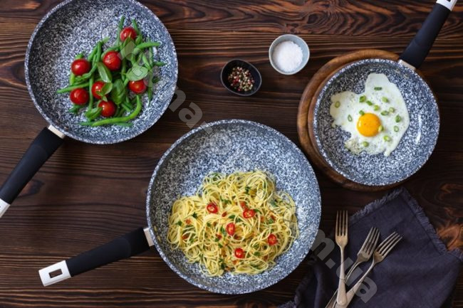 - Сковорода имеет трехслойное антипригарное гранитное покрытие.