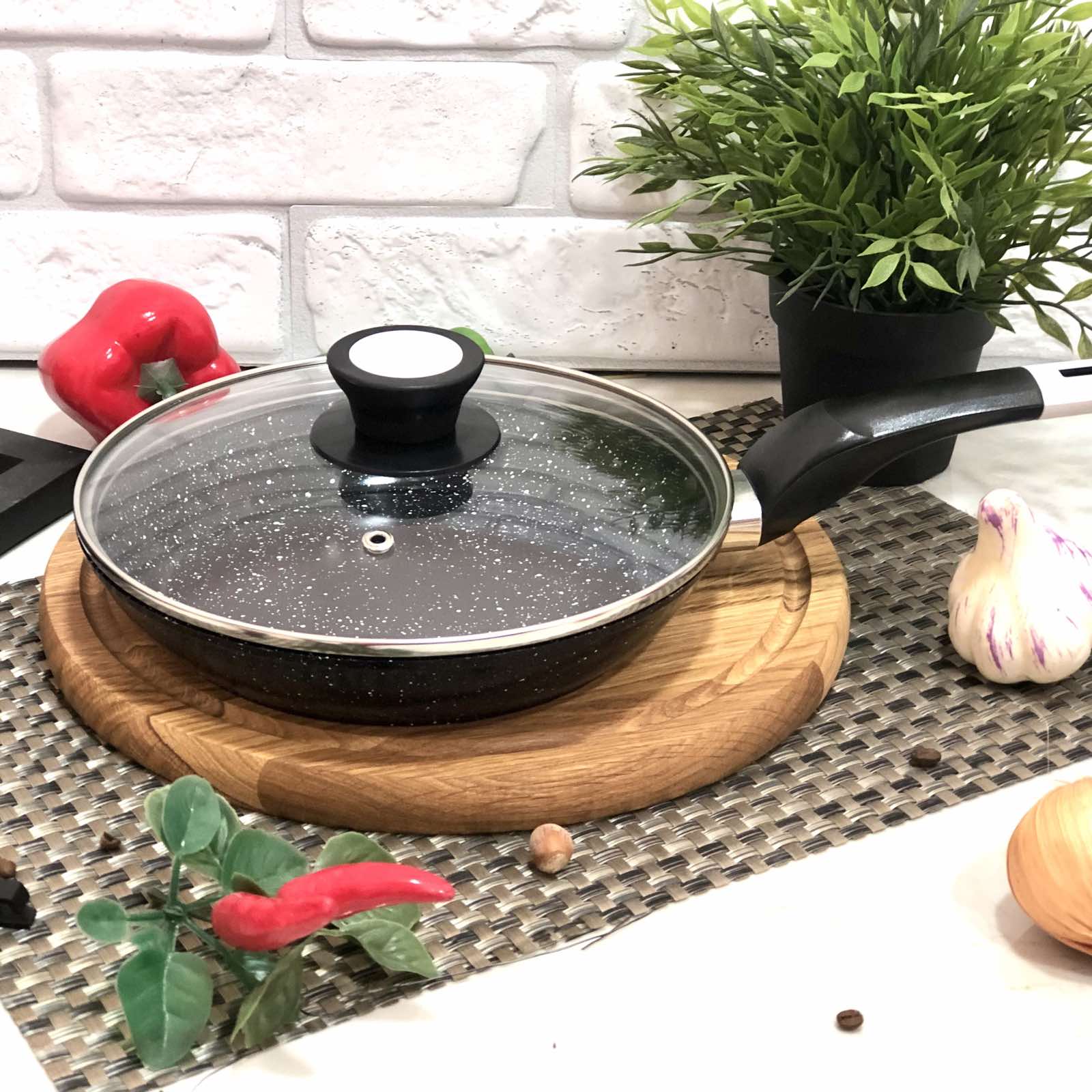 Удобная в использовании за счет гранитного покрытия, которое позволяет жарить без всяких проблем без масла или с минимальным количеством масла. Изготовлена из высококачественного литого алюминия, который характеризуется высокой теплопроводностью. Ручка сковороды изготовлена из бакелита, не нагревается, не деформируется. Стеклянная крышка изготовлена из толстого, устойчивого к высоким температурам материала. В такой сковороде можно жарить и тушить овощи, мясо, рыбу, готовить соусы и зажарки для супа или борща и другие кулинарные шедевры.Особенности сковороды из алюминия A-Plus - 1477