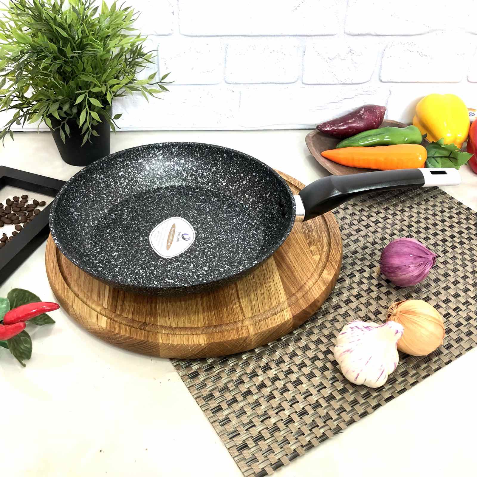 Сковорода удобная в использовании за счет гранитного покрытия, которое позволяет жарить без всяких проблем без масла или с минимальным количеством масла. Изготовлена из высококачественного литого алюминия. Гранитное покрытие аккумулирует тепло, равномерно распределяет его по поверхности. Ручка сковороды изготовлена из бакелита, не нагревается, не деформируется. В такой сковороде можно жарить и тушить овощи, мясо, рыбу, готовить соусы и зажарки для супа или борща и другие кулинарные шедевры.Особенности сковороды из алюминия A-Plus - 1520