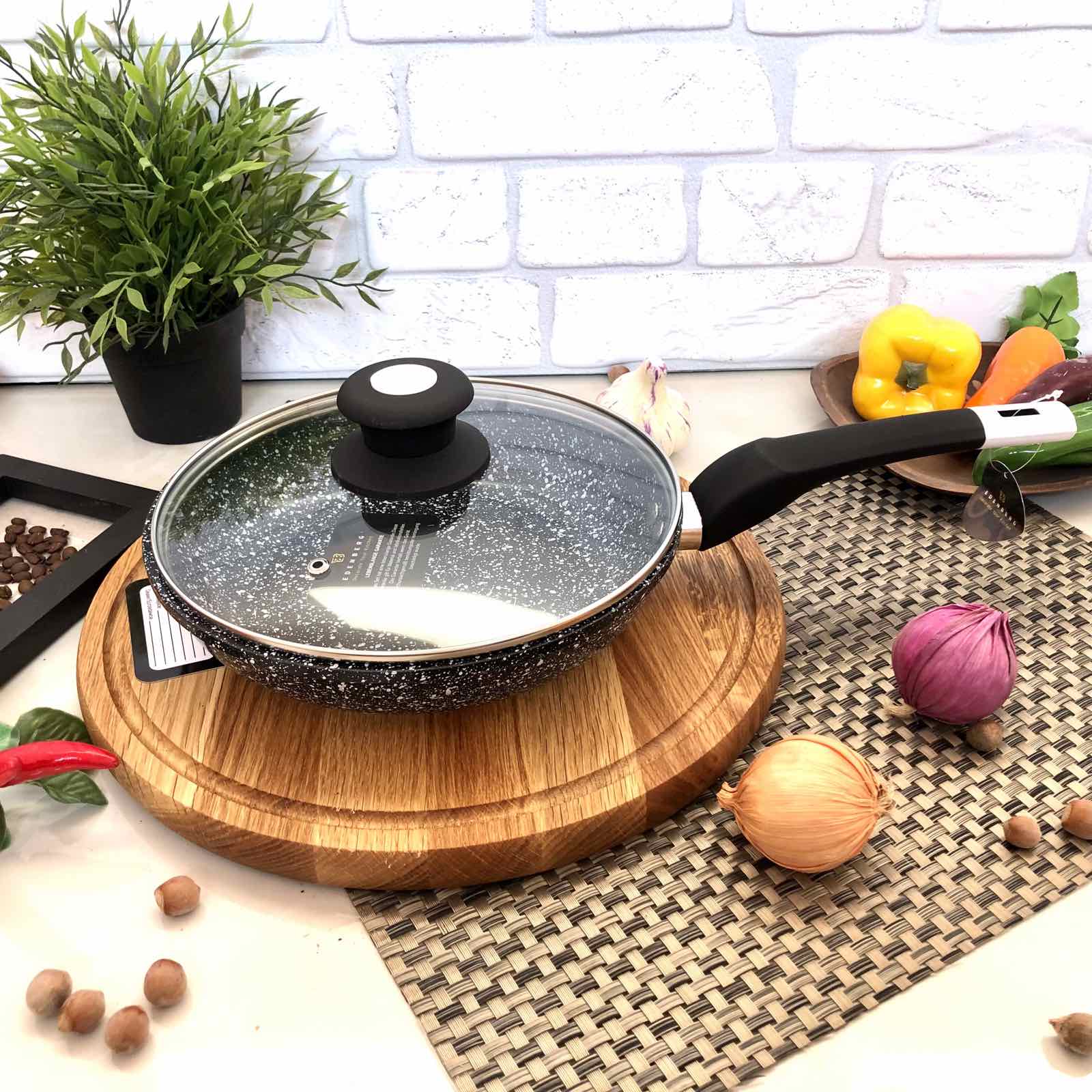 Сковорода с крышкой из прочного алюминия с антипригарным гранитным покрытием. Изысканный, эстетичный и современный дизайн. Эргономичная ручка из бакелита черного цвета удобная для захвата и не позволит обжечься. Идеально подходит для жарки и тушения мяса, овощей, рыбы и других продуктов на всех современных видах плит. При правильном уходе сковорода прослужит вам долгие годы, не переставая радовать вас вкусными и полезными блюдами.Особенности сковороды с крышкой Edenberg EB - 9165