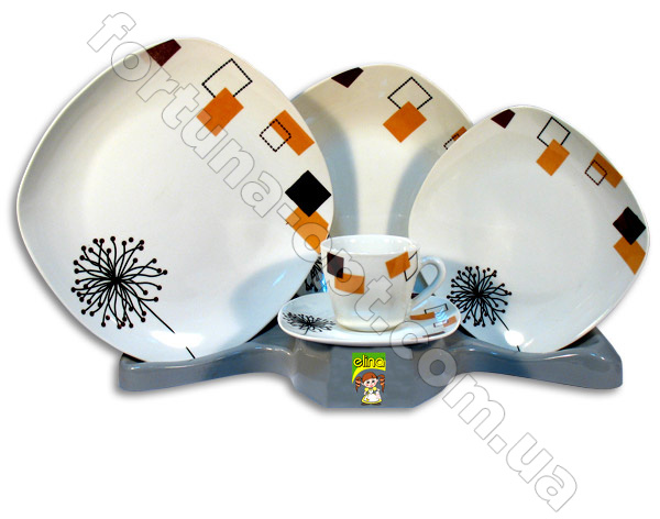 Cостав: подставная тарелка - 6 штук,диаметр - 26,5 см. Суповая тарелка - 6 штук,диаметр - 20,5 см.Десертная тарелка - 6 штук,диаметр -19 см.Чашки (220 мл.) - 6 штук,блюдца - 6 штук.