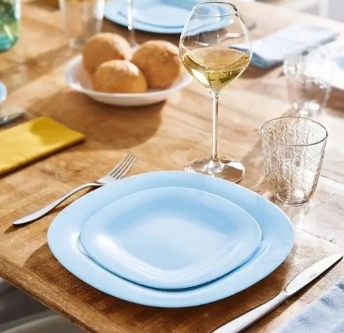 Стеклокерамическая тарелка диаметром 27 см квадратной формы. Цвет: бирюзовый. Тарелку можно использовать в микроволновке и мыть в посудомоечной машине. Выдерживает температуру от -40 до +300 градусов.