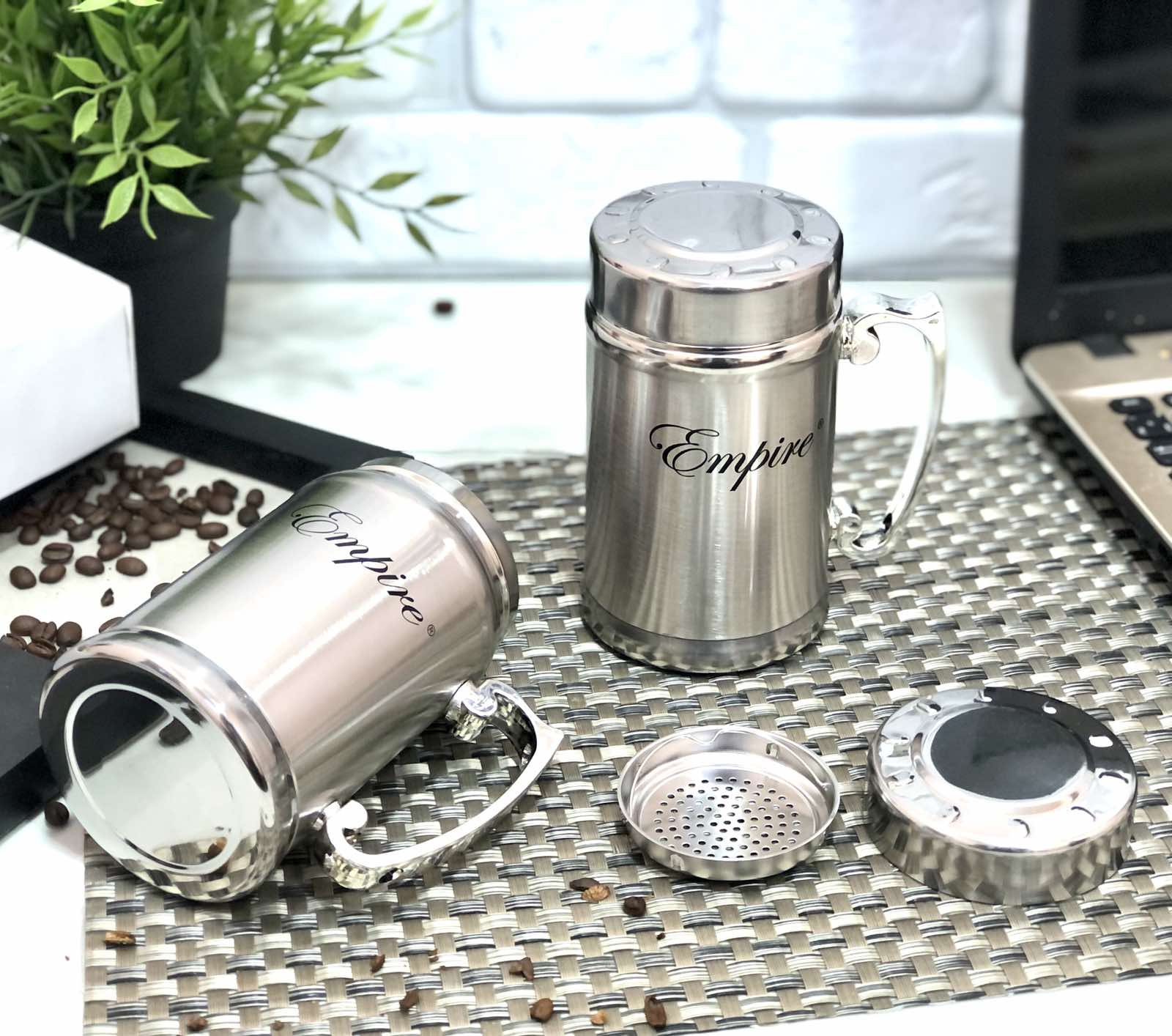 Термокружка от производителя Empire имеет двойную стенку, а также заварник-сеточку. Отлично подойдет для активных путешествий, как для обычного передвижения на автомобиле, поезде, так и походов в лес и на природу. Специальная "Крышка-непроливайка" предотвращает пролитие содержимого во время передвижения, а внутренняя сетка позволит заварить чай и не допустить попадания листьев во время питья. Изготавливается кружка из нержавеющей стали и вмещает в себя 300 мл жидкости. Особенностью в использовании является специальная ручка, которая не нагревается. Запрещено подогревать на газовой или электроплите.Особенности термокружки нержавейка Empire EM - 9857