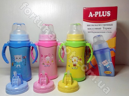 Термос детский 220 мл. Термос 1780 состоит из внутренней и внешней колб, клапана, крышки-чашки. Внутренняя колба термосов выполнена из нержавеющей стали. Термосы из нержавеющей стали не окисляются, они не подвержены ржавчине и надолго сохраняют красивый внешний вид. Термосы имеют вакуумную изоляцию, которая позволяет сохранять напиток холодным или горячим длительное время. Удобные ручки по бокам термоса.Характеристики детского термоса A-Plus - 1780